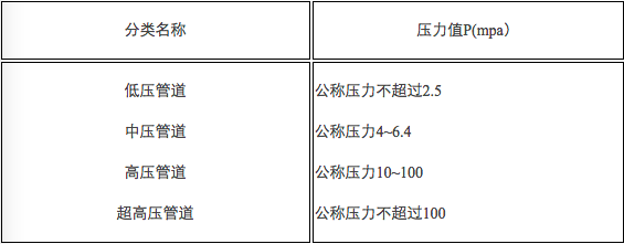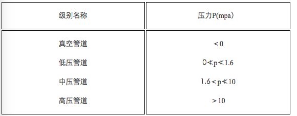 (2)因為真空管道和低壓管道在技術(shù)要求上除有真空度差別外,其它基本都相同,有時(shí)也將這兩類(lèi)合并稱(chēng)為低壓管道。而把PN≥10MPa的高壓管道中10<PN≤100者稱(chēng)為高壓管道,而把PN>100MPa的工業(yè)管道稱(chēng)為超高壓管道,所以,又可將工業(yè)管道按介質(zhì)壓力分類(lèi)如表1-1-7所示